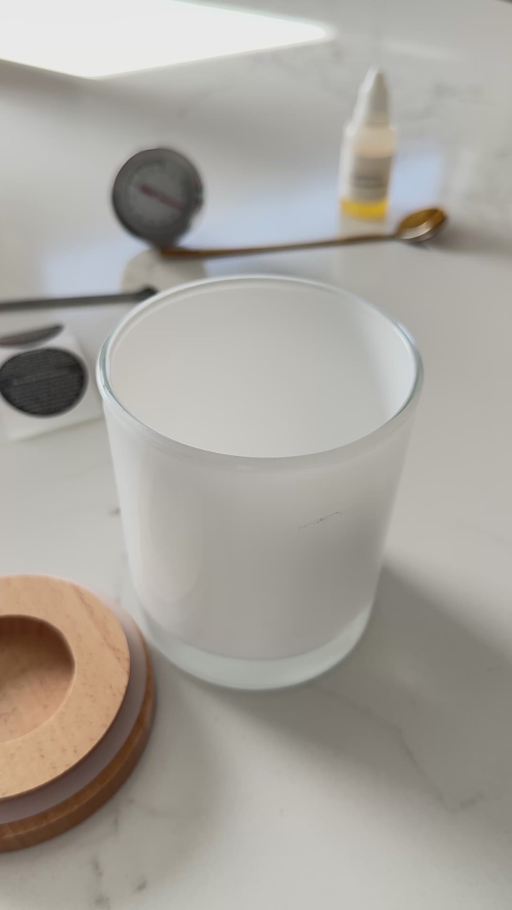 2 white glass jars with timber lids